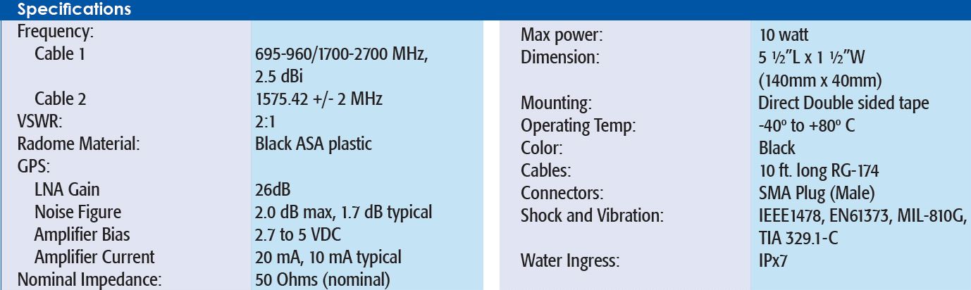 More InfoDocumentsSpecifications ReviewsLa RFMAX RG4A-10SSM es una antena combinada 2 en 1 para GPS (activa 3,3 o 5 voltios) y 3G/4G/LTE. Esta unidad está diseñada para usarse cuando las antenas típicas de montaje en techo no son prácticas debido a consideraciones de montaje, o cuando se desea que la antena sea "encubierta". La unidad se monta con cinta adhesiva (incluida) con cables RG174 de 10 pies y conectores macho SMA. Perfecto para vehículos con estaciones de acoplamiento RF de doble paso (Getac.) Antena estilo banda encubierta LTE/Celular+GPS 2 en 1 para computadoras resistentes con estaciones de acoplamiento (Getac) o módems de Sierra Wireless AirLink o Cradlepoint, etc. Funciona en LTE /Celular: 694-960/1700-2700 MHz y 1575,42 MHz GPS con LNA de 26 dB. La antena tiene cables RG174 de 10 pies y conector macho SMA. Nuestros clientes nos dicen que esto supera al MA308.A.AB.001 / 931-1140-ND