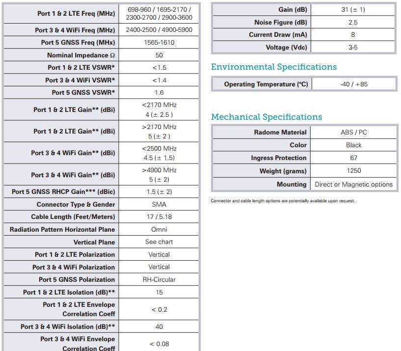 - Two ports of 3G/4G/LTE Cellular: 698-960/1695-2170/2300-2700/2900-3600 Mhz with SMA-Male Connectors