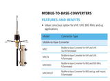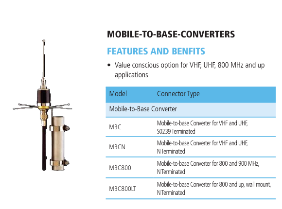 More InfoSpecifications ReviewsThe TE Connectivity MBCN is a Mobile to Base Station Antenna adapter for use with VHF and UHF antennas. The kit includes NMO to N-Female adapter and (4) 22 inch long ground plane radials.