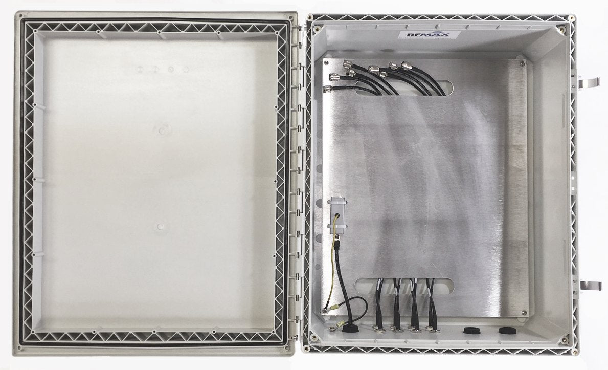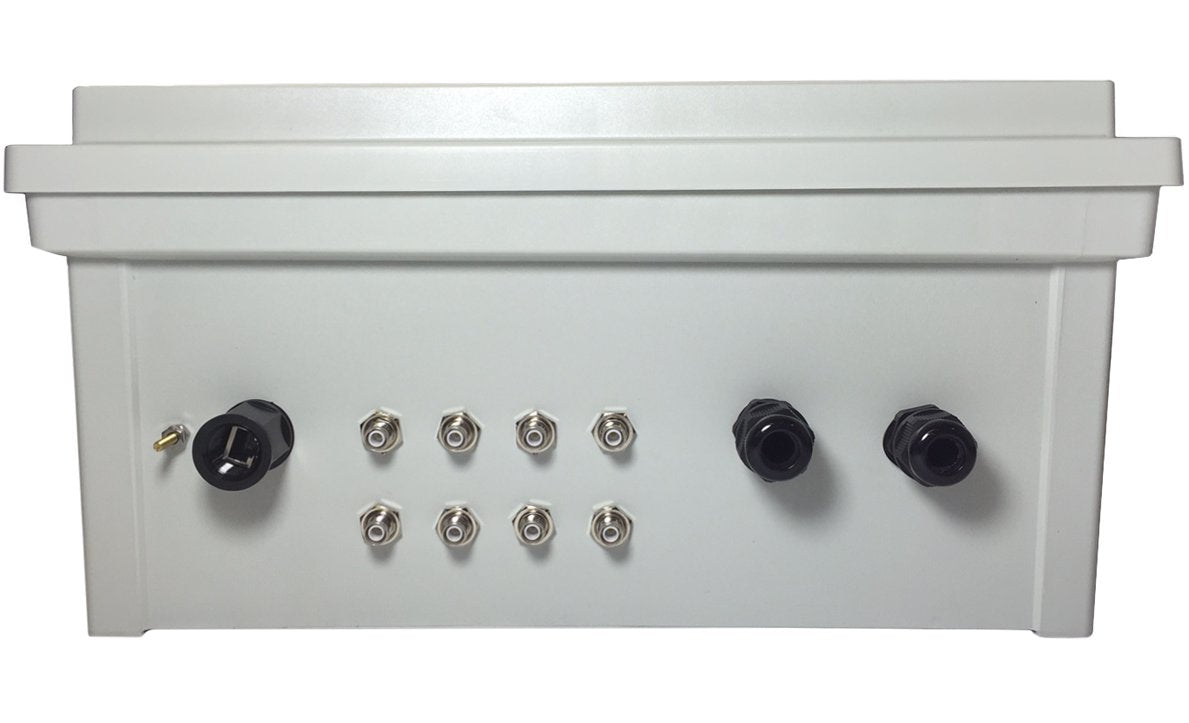 20x16x8 inch NEMA 4 polycarbonate enclosure for 8 port RFID readers from Zebra,Impinj, ThingMagic, Alien, etc. Includes: mounting plate big enough for Reader, GPIO and power supply, (1) POE/ethernet gland, (1) POE surge suppressor (2) General purpose gland & (8) bulkhead RPTNC-female cables.