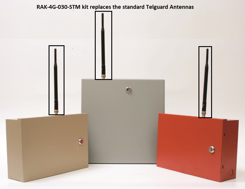 The RFMAX part number RAK-4G-100-STM is a three piece kit for extending the reach of your cellular alarm panel. Designed to use with Telguard TG-7, TG-7A, TG-7FS alarm systems. This Antenna kit is equivalent to Telguard EXD-0