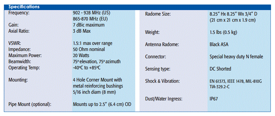 This is an IP67 rated. Heavy Duty, RHCP, 8.25x8.25 inch RFID antenna that operates in the 902-928 MHz, FCC RFID band, with integrated N-Female connector.