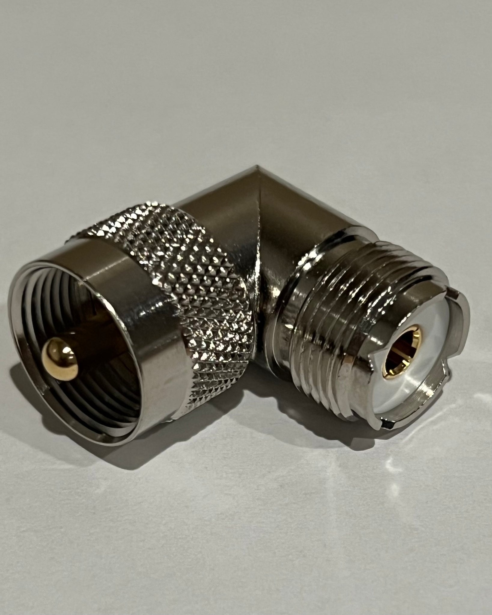 Standard UHF Female to Standard UHF Male Right Angle Adapter: SUF-SUMRA