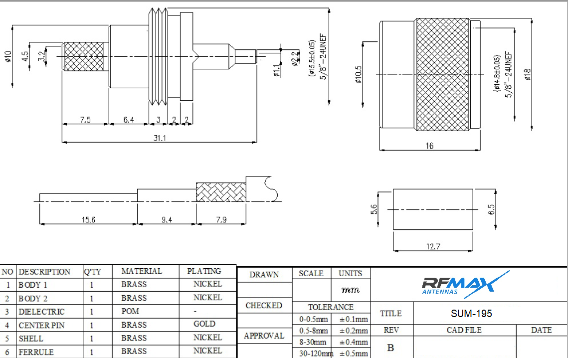 SUM195 UHF Male Crimp Connector is designed for 50 Ohm RG58, LMR195 and equivalent coaxial cables, similar to RFU-505-ST.